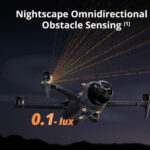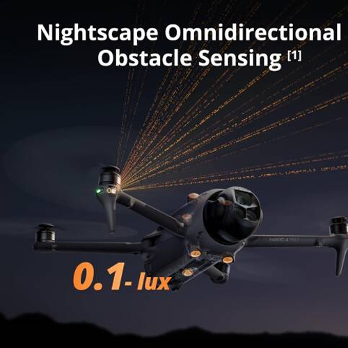 Mavic 4 Pro is equipped with six high-performance, low-light fisheye sensors and dual processors for high-resolution environmental awareness. It achieves omnidirectional obstacle avoidance at speeds up to 18 m/s even in lighting conditions as low as 0.1 lux, such as environments illuminated only by streetlights. Whether navigating through canyons or urban landscapes with poor satellite signals, this high-performance visual system ensures precise drone positioning. In near-pitch-black environments with brightness below 0.1 lux, it can still use its forward-facing LiDAR to detect obstacles ahead and quickly brake to avoid collisions.